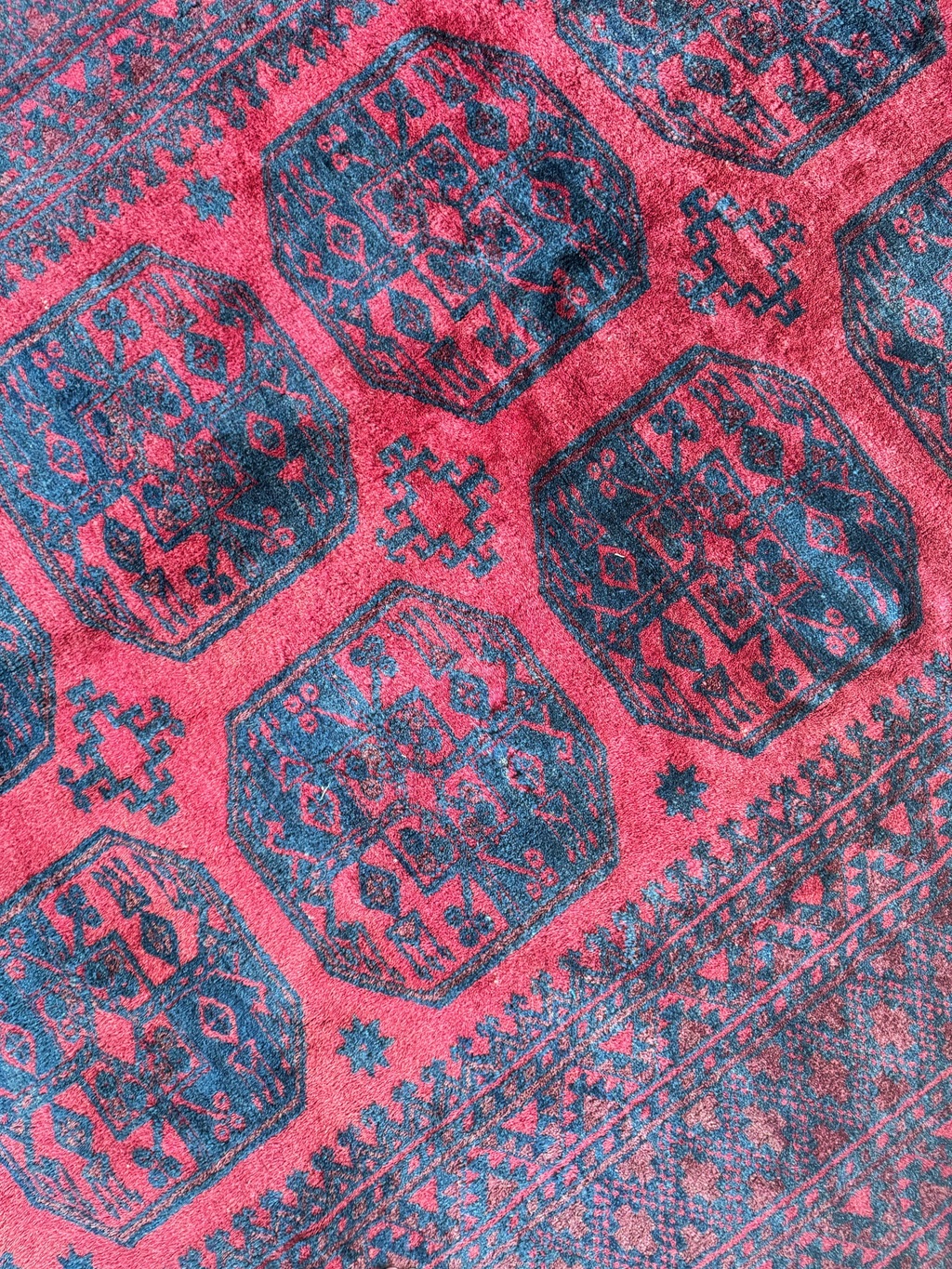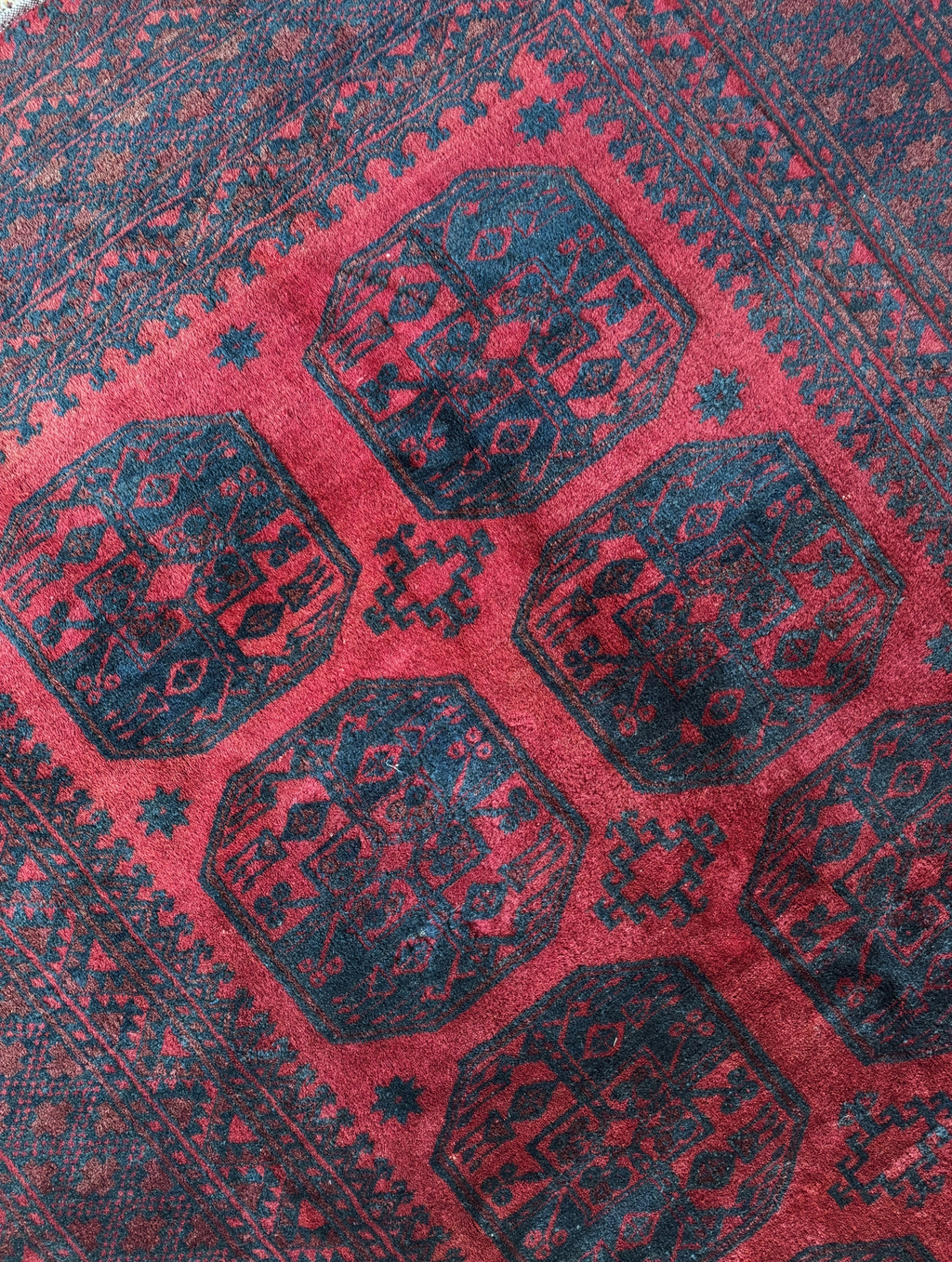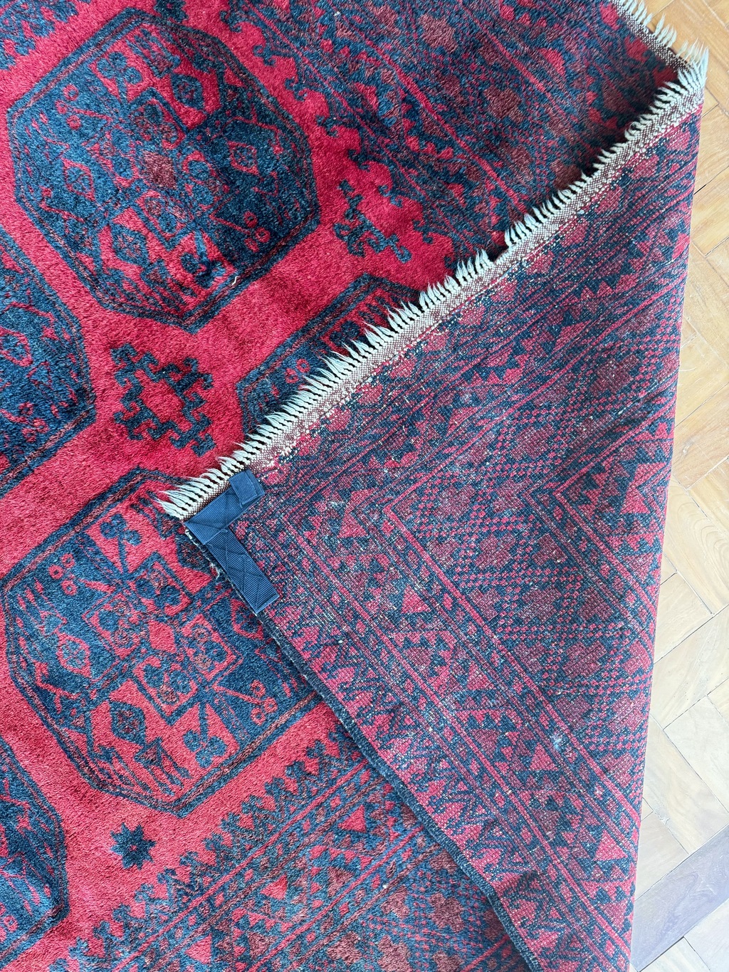 Aquele clássico sempre moderno: tapete afegão, fundo vermelho e detalhes em preto. Vai com tudo, para vários estilos de decoração. Lã alta e sem defeitos, franjas e cordão restaurados. Lavado profissionalmente e pronto para uso.