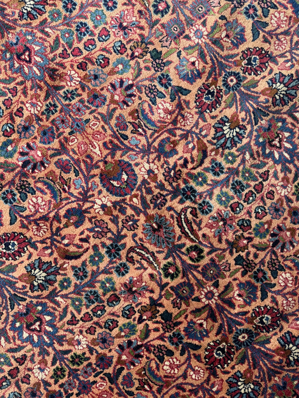 Belissimo Tabriz em tons de blush, nossa tonalidade favorita na decor. Todo floral, motivos continuos sem medalhão central - excelente para usar embaixo da cama ou mesas de jantar e sala de estar. Sem defeitos - lã, cordão e franjas em perfeito estado. Feito em lã sobre algodão. Lavado profissionalmente e pronto para uso.