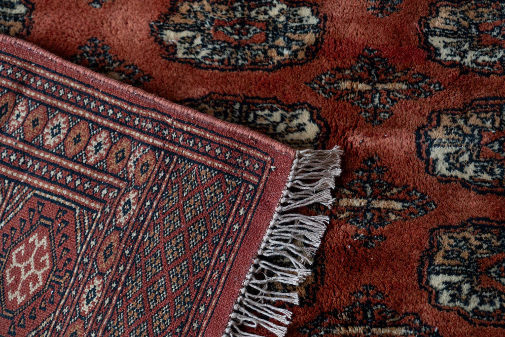 Este Bokhara é oriundo do Paquistão e tem um lã alta e aconchegante. Seu tom de vermelho puxa para um alaranjado bonito e original. Em lã sobre algodão. Franjas e cordões em ótimo estado. Lã sem defeitos. Lavado profissionalmente e pronto para uso.