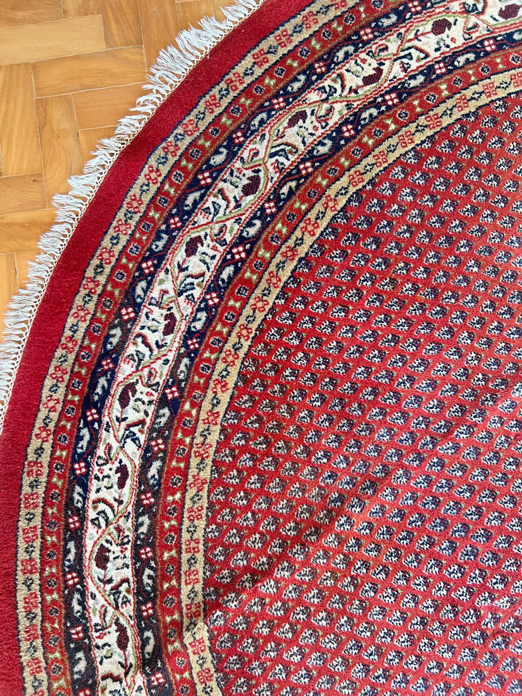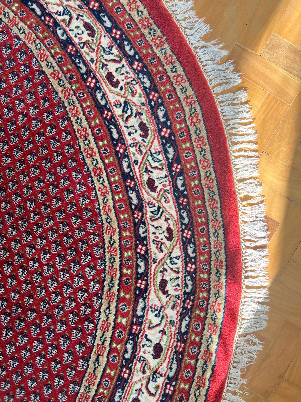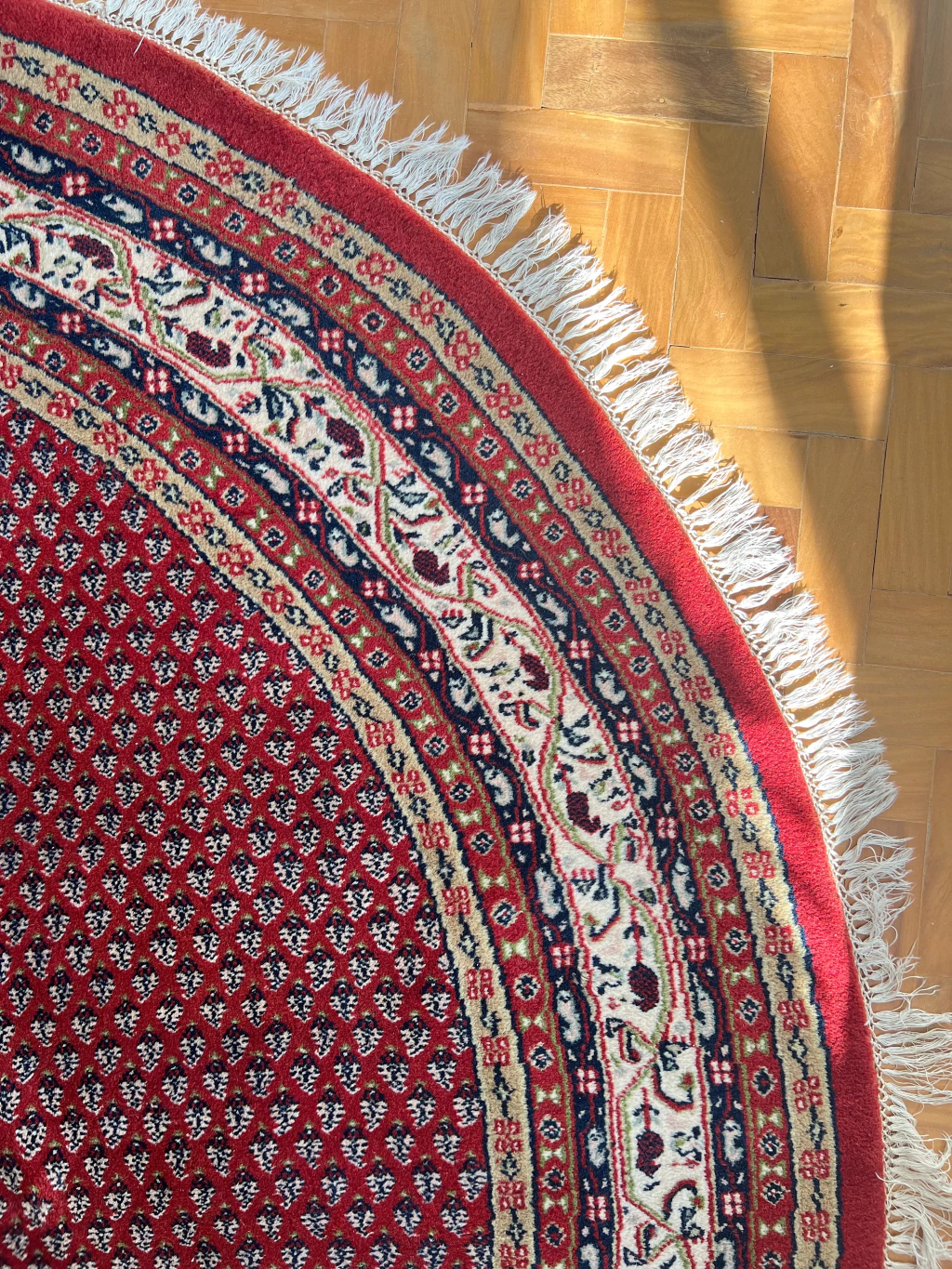 Fayna é um tapete Sarabend Indiano redondão, 260 cm de diâmetro. Possibilidades mil com essa peça que vai virar a protagonista da decor. Sem defeitos - franjas, lã e cordão em excelente estado. Lavado profissionalmente e pronto para uso.