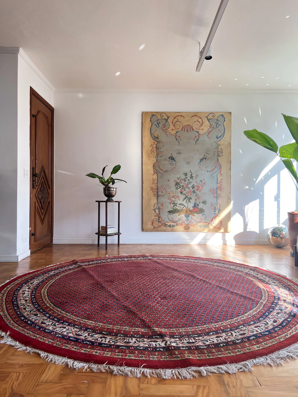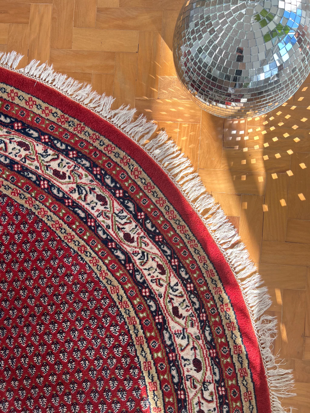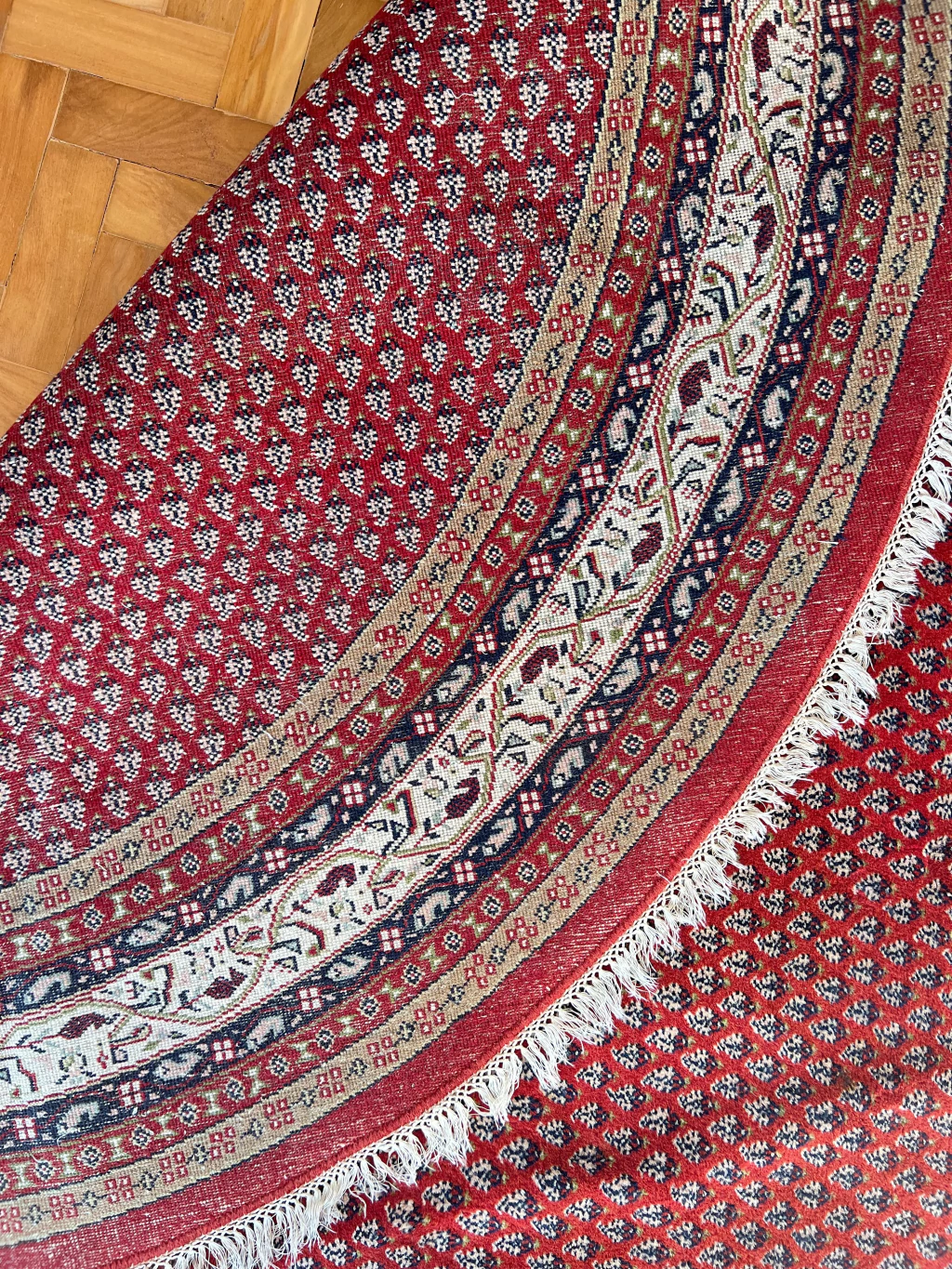 Fayna é um tapete Sarabend Indiano redondão, 260 cm de diâmetro. Possibilidades mil com essa peça que vai virar a protagonista da decor. Sem defeitos - franjas, lã e cordão em excelente estado. Lavado profissionalmente e pronto para uso.