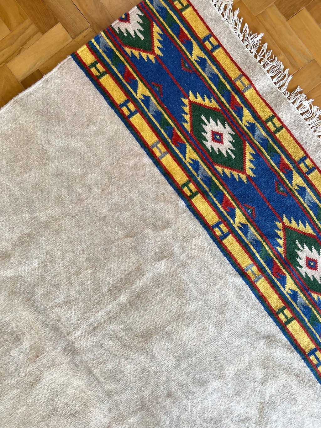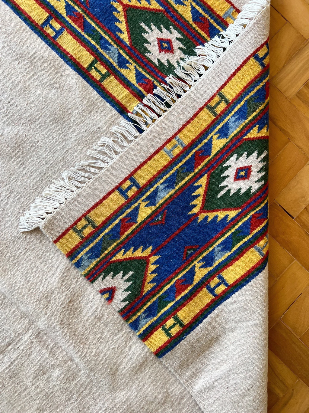 Ilari é um tapete Kilim Indiano bem minimalista, mas com personalidade. Seu tom predominante puxa pra um cinza bem clarinho, com barras em tons vibrantes de amarelo e azul royal. Sem nenhum defeito - lã, franjas e cordão em excelente estado. Lavado profissionalmente e pronto para uso.