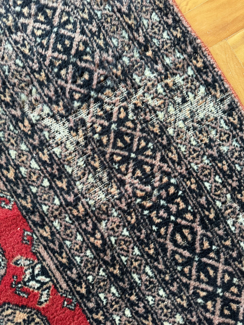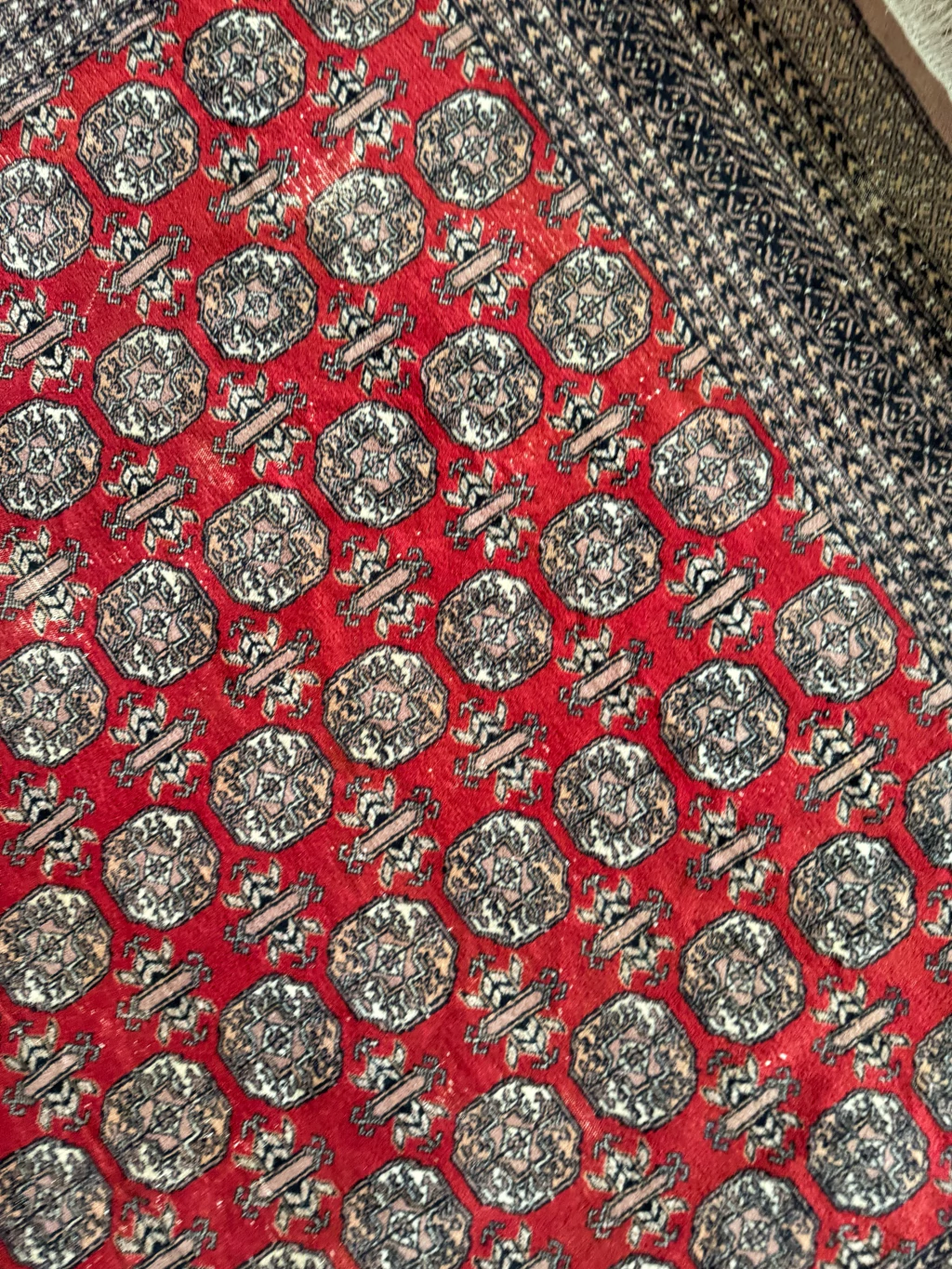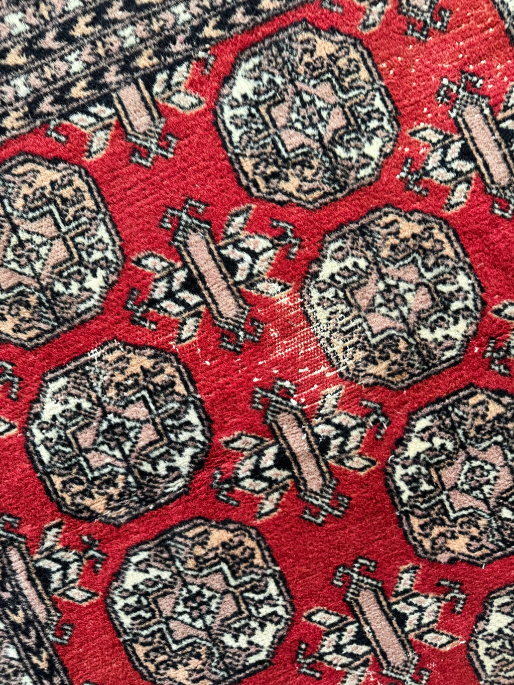 Um Karachi em vermelhão clássico, tamanho ótimo e pequenas partes rapé mostradas em foto e que nao atrapalham em nada a beleza do tapete. Cordões e franjas sem defeitos. Lavado profissionalmente e pronto para uso.