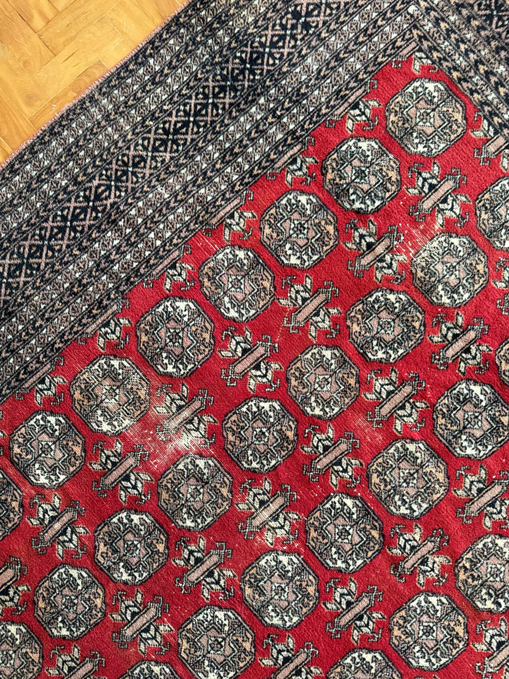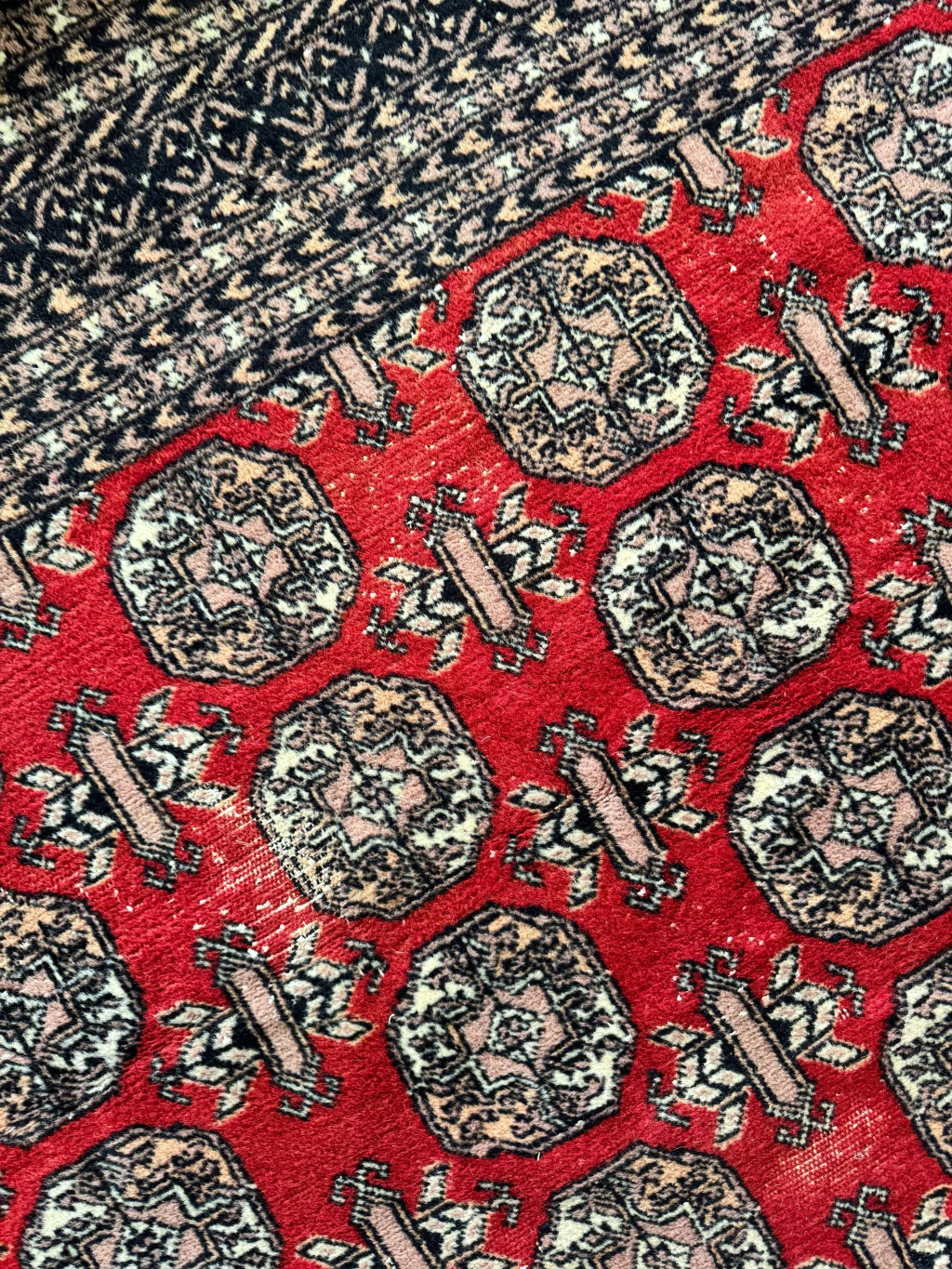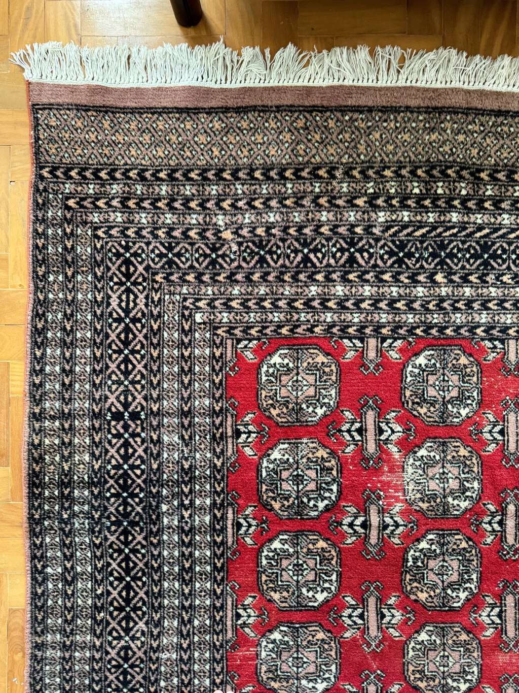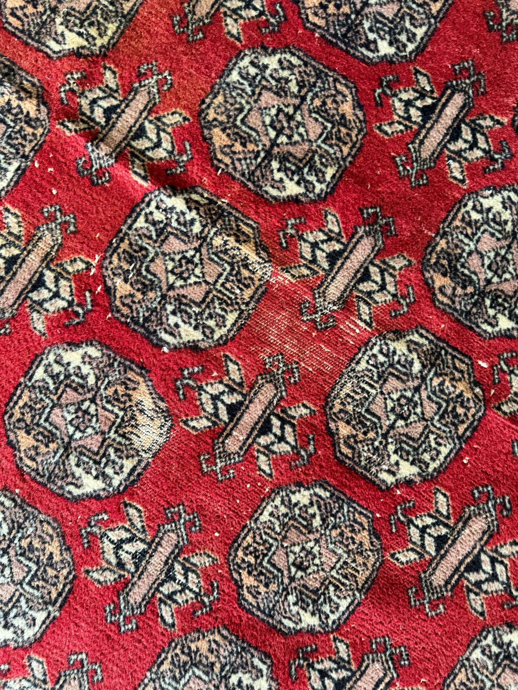 Um Karachi em vermelhão clássico, tamanho ótimo e pequenas partes rapé mostradas em foto e que nao atrapalham em nada a beleza do tapete. Cordões e franjas sem defeitos. Lavado profissionalmente e pronto para uso.