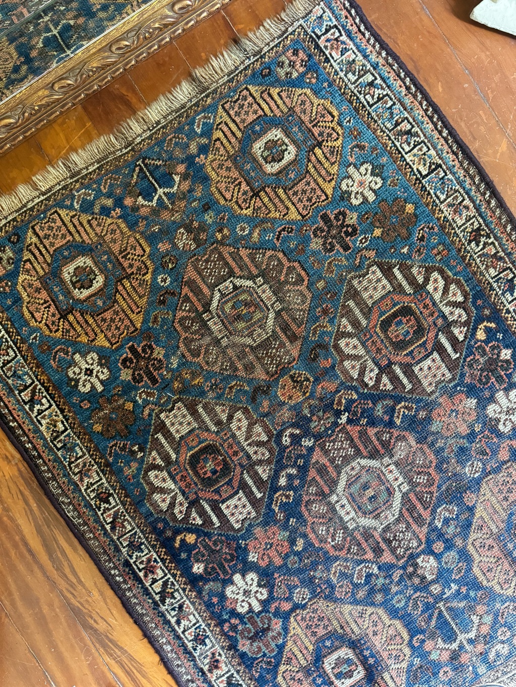 Tapetinho Caucasiano antigo, proporcionalmente desgastado, em fundo azul, lindinho que só! Em lã e higienizado a seco.