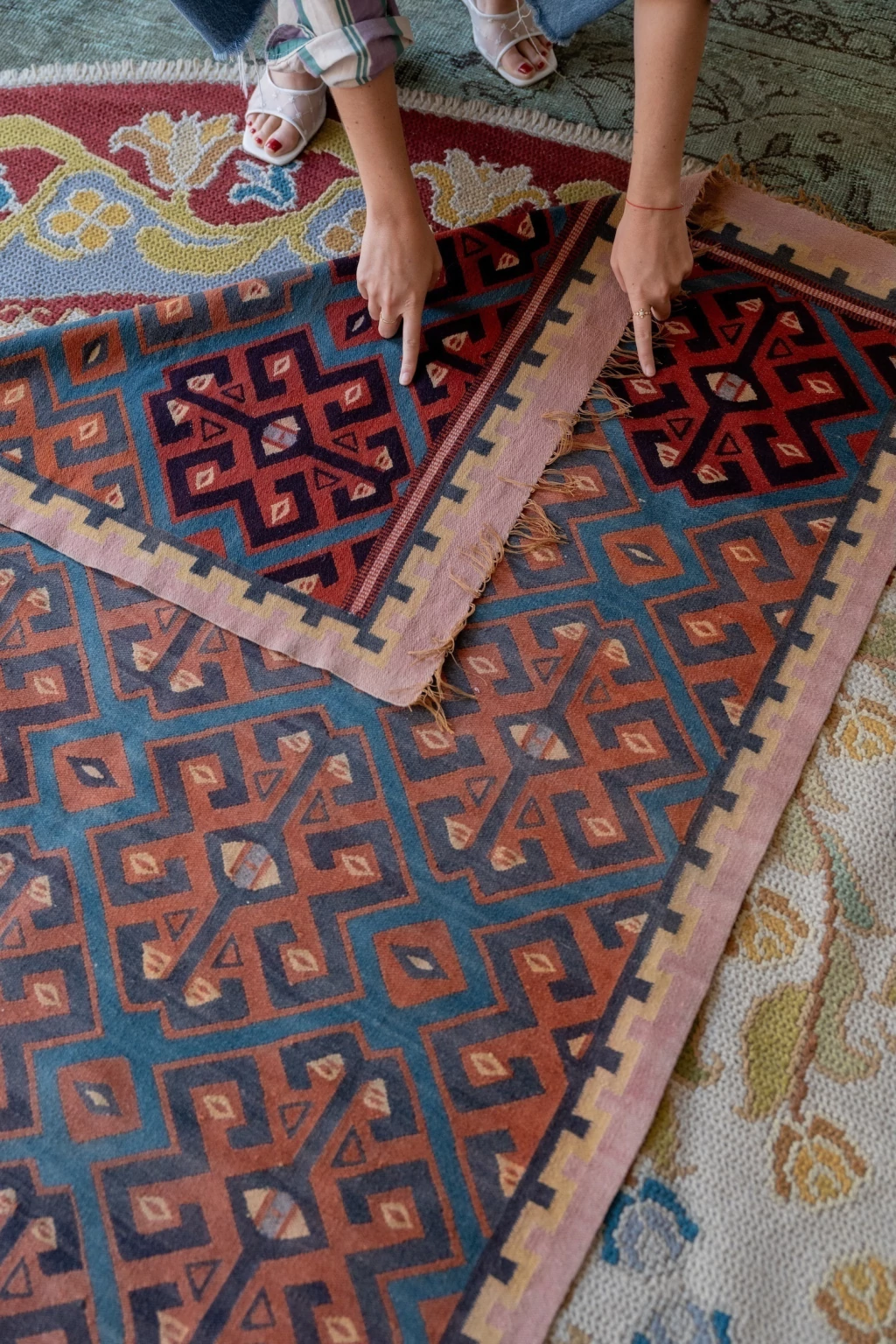 Tapete Kilim russo muito original e possui uma característica única: o abrash, que é a variação da tonalidade da lã que foi utilizada pelo artesão. Percebam nas fotos que a primeira faixa de medalhões tem um tom mais forte do que o restante do tapete que ocorre pois os artesãos usam tingimentos naturais que podem acabar antes do tapete ser finalizado. Ainda mais único e especial. Lã, cordões e franjas em excelente estado. Lavado profissionalmente e pronto para uso.