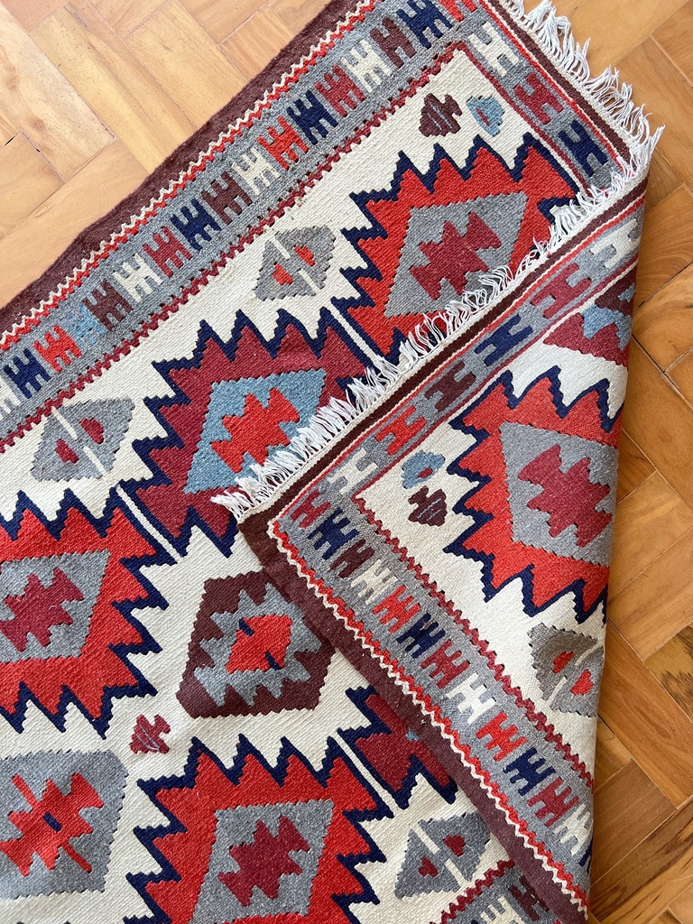 Luba é um tapete Kilim Turco com tamanho versátil, que pode ser tanto passadeira quanto tapete. Cores vibrantes de laranja em fundo creme, bem lindão. Franjas, cordão e lã em excelente estado. Lavado profissionalmente e pronto para uso.