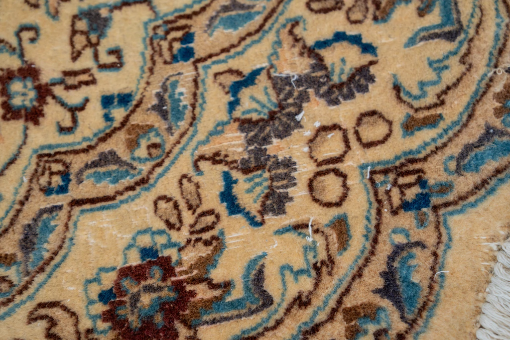 Tapete Nain redondo, fundo bem creme e detalhes em azul. Possui defeitinhos na lã mostrados em foto e refletidos no valor final da peça. Franjas e cordões em ótimo estado. Lavado profissionalmente e pronto para uso.