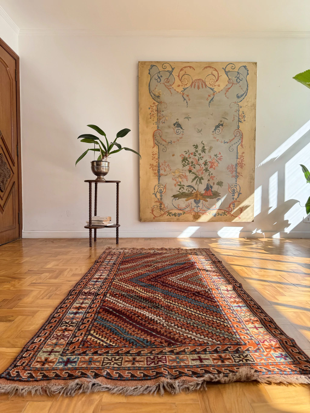 Tapete Turco 100% lã, em excelente estado. Franjas e cordão originais. Alegre e colorido, perfeito para a lateral da sua cama, para a frente de um aparador, para um corredor. Lavado profissionalmente e pronto para uso.
